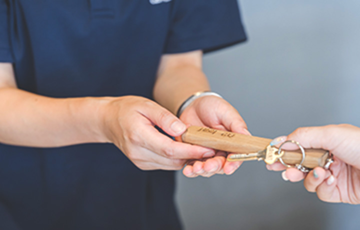 業務開始後はまずフロントで、チェックアウトされるお客様を笑顔でお見送りします。