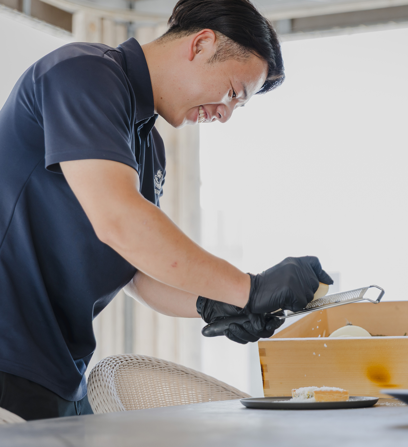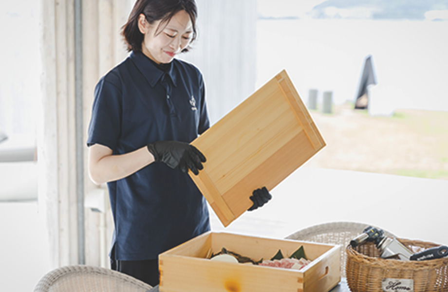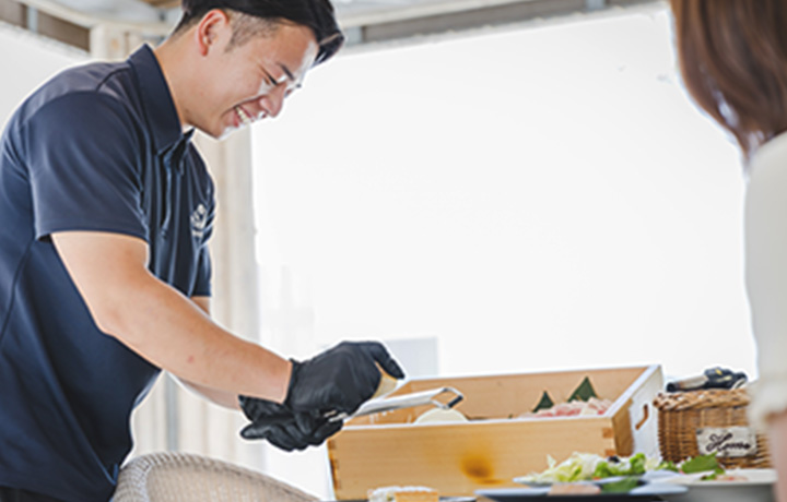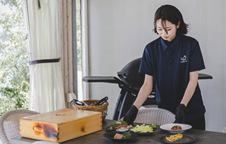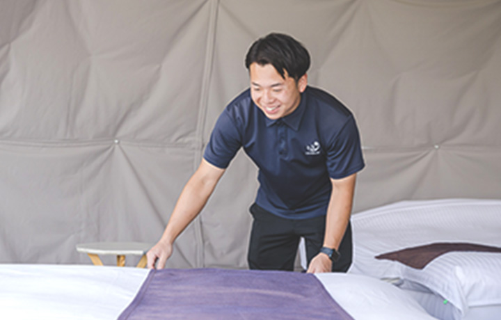 - 備品設置やグリル清掃、お客様対応、シフト作成などを行なっています。支配人として、自分の業務だけでなく全体に目を配り、スタッフと連携しながら、お客様に快適に過ごしていただけるよう努めています。