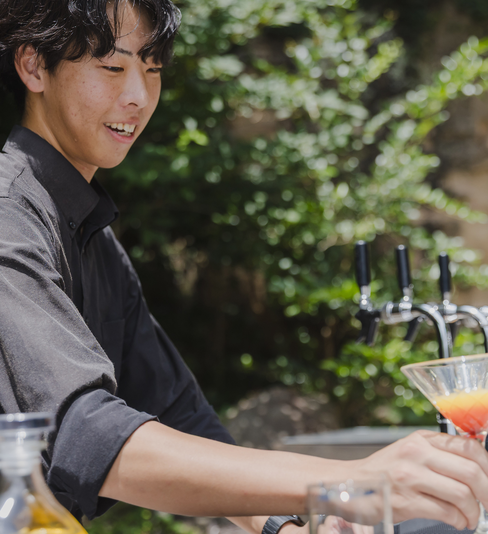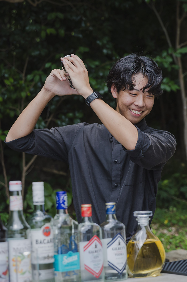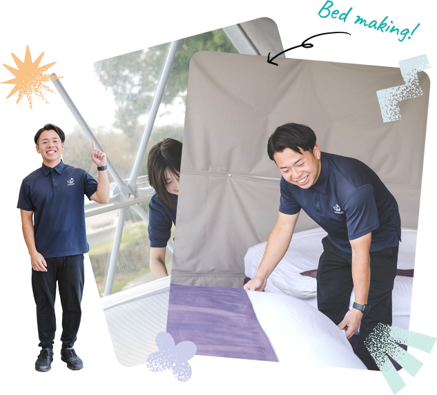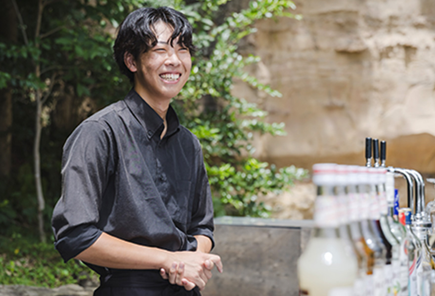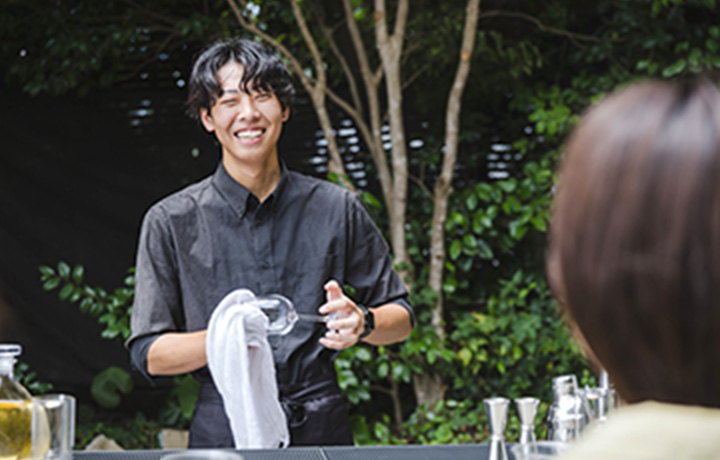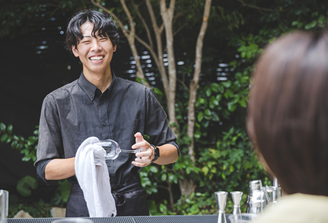 - 客室清掃やチェックイン対応など幅広い業務を担当しています。中でも好きなのはバー対応で、最初はお酒の知識を覚えるのに苦労しましたが、今ではお客様との会話を楽しみながら取り組める、やりがいのある仕事です。