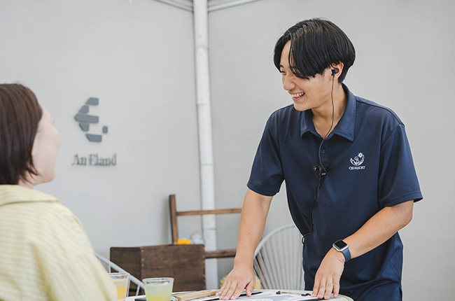 - 人を楽しませる仕事ができると思ったからです。転職する際にそれを軸に考え、非日常の体験をお客様に提供するリゾート施設で、自分もその一員として働きたいと思いました。